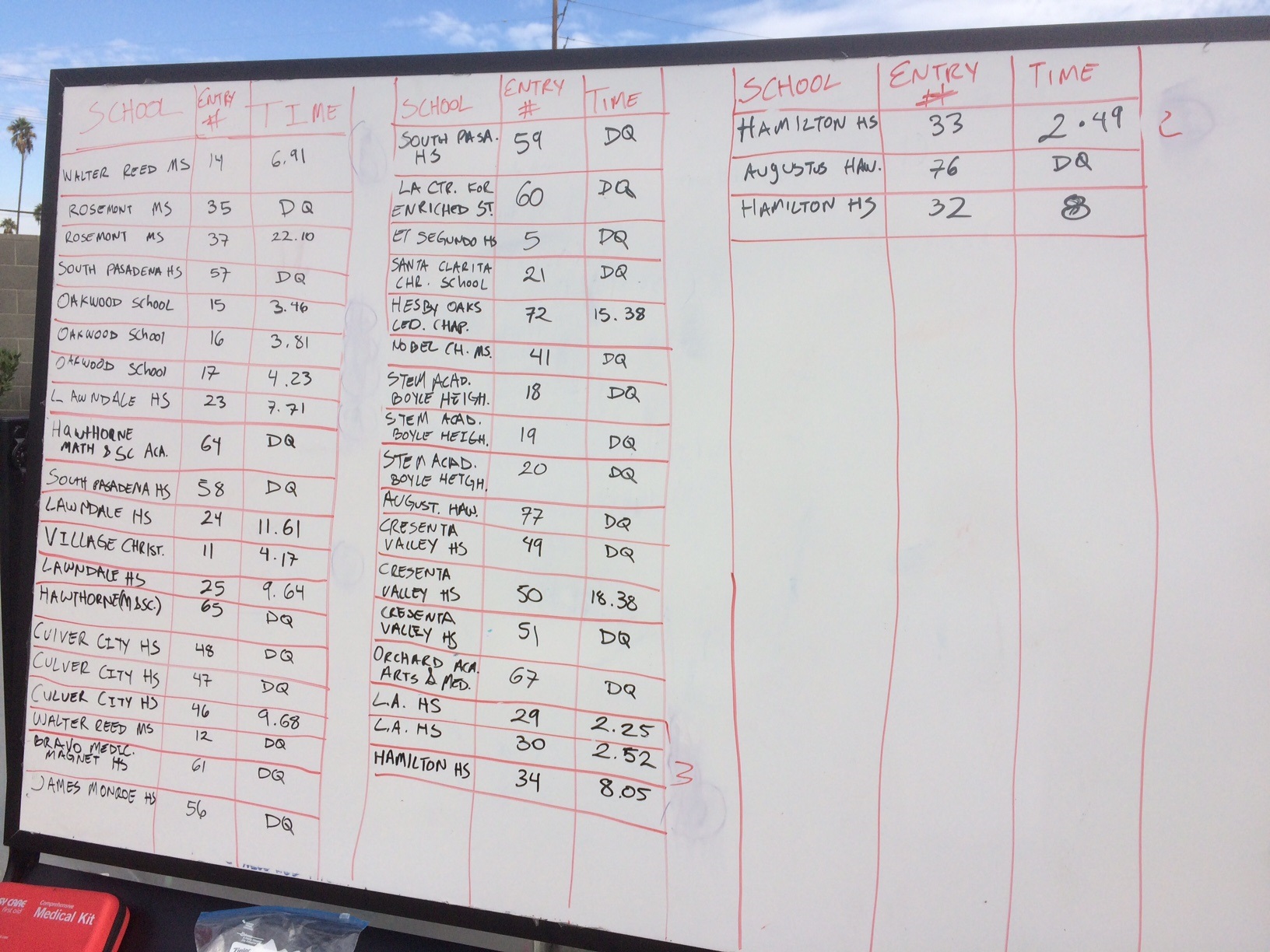 Kevim, Micheal, and Ian's devide worked as planned. It transported the fish and water into the reception point. They got a time of around 18 seconds, 15 of which were penalty seconds, and got 190 grams of water. We also shoed the class the scores, which you can look at below.