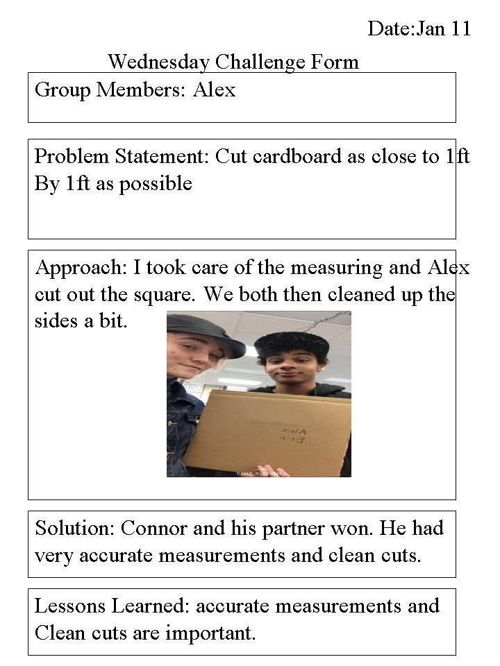 Its Wednesday, so that means its time for a Wednesday Challenge. Our challenge for the day is to cut a piece of cardboard into a 1 foot by 1 foot square. The team to be the closest to the measurements win. I was paired with Alex. He did the cutting while I measured. We finished towards the end of the period and started working on our Wednesday Challenge Forms.Square Challenge