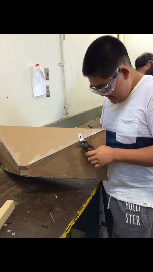 Happy Monday everyone! Today the vets split off into the shop to work on our devices. I assisted with the vaccum idea and Alvin and I "waterproofed" a cardboard model of our funnel, which was modified so the fish could fit through no matter which way it was facing.