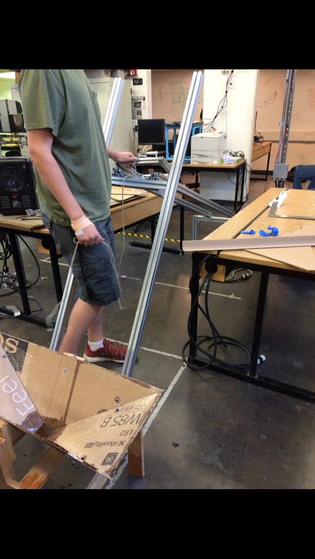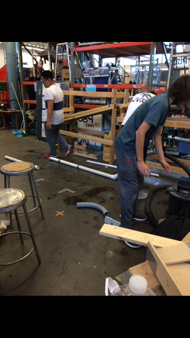 Connor and I figured out how to make the cart stay on the ropes and brainstormed how to get it over the end of the device to dump the water. Keilah was cutting down wood when the saw broke. So we had to use the table saw, which took us awhile because a truck was blocking the area where we normally put it so extension cords saved the day.