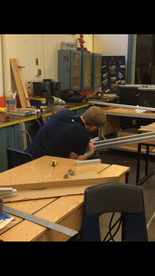 In the shop we are beginning to assemble the cart for our device. Keilah was working on the ring to hold the cup and Alvin and I were putting together the stand. Connor was off cutting down the wheels.
