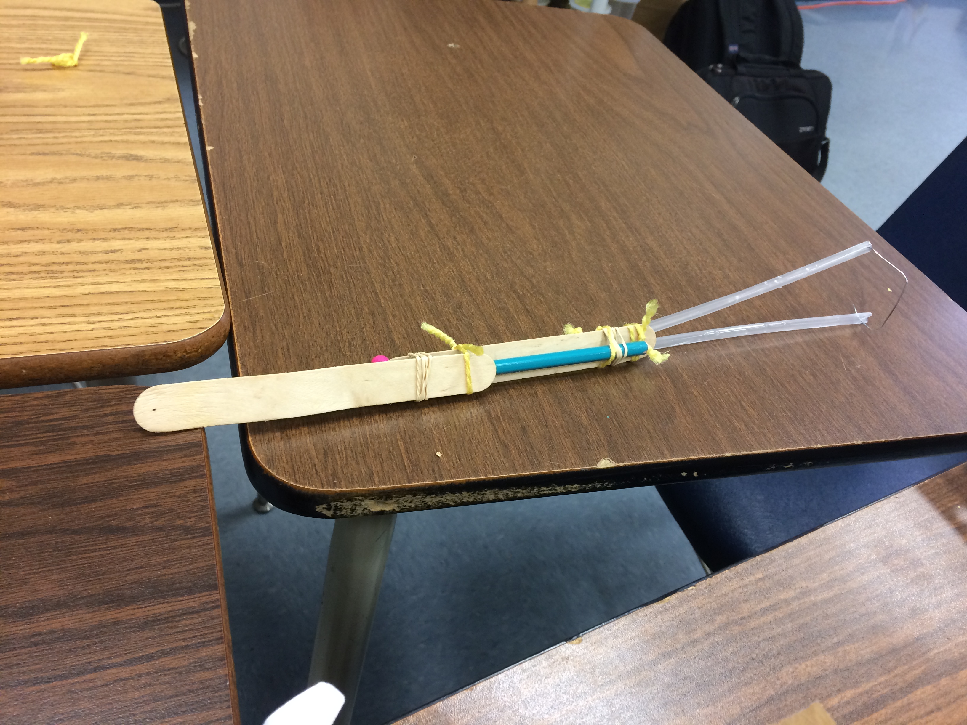 2 rubber bands, 3 pieces of string, 2 straws, a tack, and 2 popsicle sticks. Our "device" looked like this: