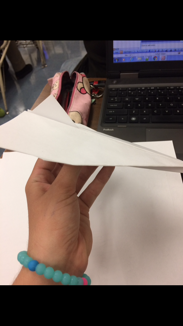 Happy Wednesday guys! During lunch today, I went to McDonalds with Karen. By the time I got back, the bell had rung to go to class and I didnt get to eat my chicken nuggets. They are going to be sitting at my feet until the end of class. Im actually kinda sad lol. Anyways, in class today Mr.Miller made changed to the grades so I now have an 87.50% in the class; hopefully I can get that up to an A soon. Today's Wednesday Challenge is all about paper airplanes. Im paired up with Connor. The task in to make an airplane that goes the farthest. We design a plane, the switch designs. Mr.Miller doesnt want us to use sketchup today, so we have to draw our design. We can only use paper today, no tape, no glue, no nothing. While Connor is experimenting with how to fold the paper, I am updating my website and filling out the Wednesday Challenge form. We didnt have time to "fly" our plane so Connor and I will do so first thing tomorrow in class.The group we traded with gave us a list of 3 videos to watch, but we didnt have enough time to do so.