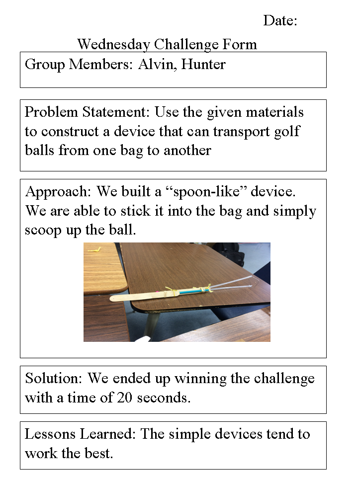 The challenge continues! Today Michael and I finished up the spreadsheet for the Wednesday Challenge! We collected all the devices at the end of the class period and we will Judge them first thing in class tomorrow.